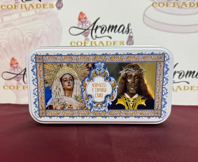 Lata metálica vacía 19*10*5 cm Nuestro Padre Jesús Cautivo y Rescatado y María Santísima de la Trinidad, Medinaceli