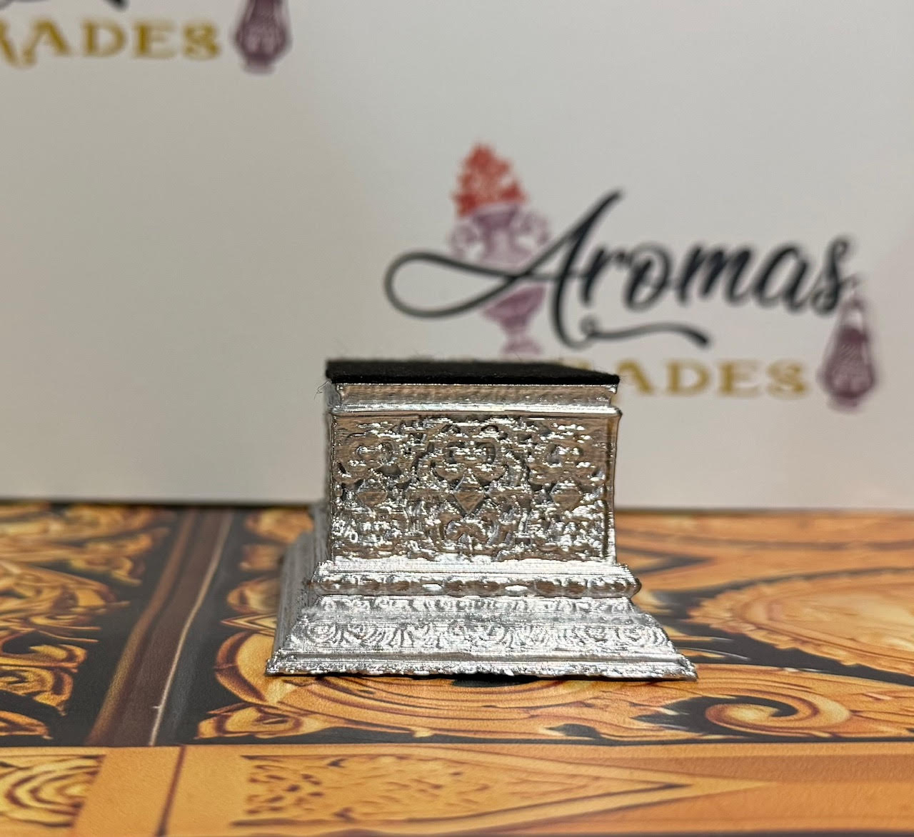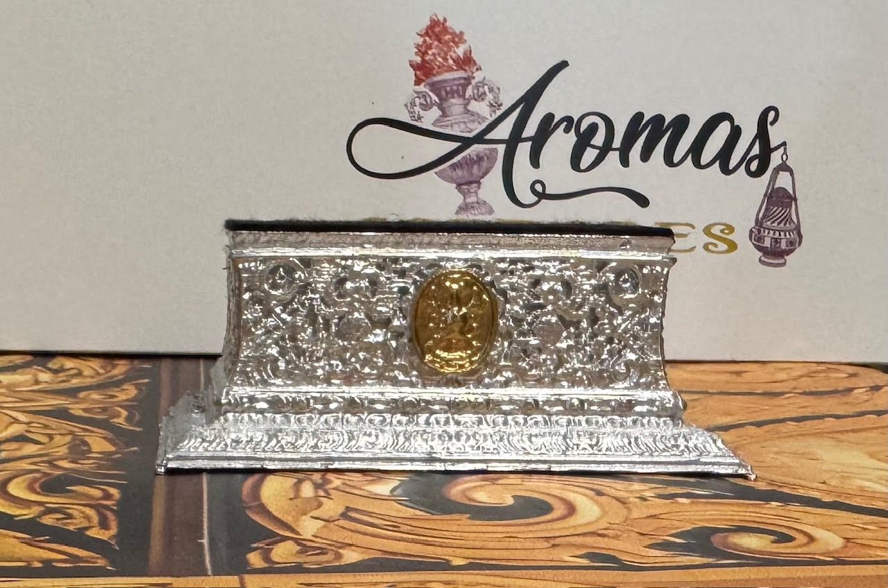 Peana plateada para bustos o imagen, 10*6*4 cm.